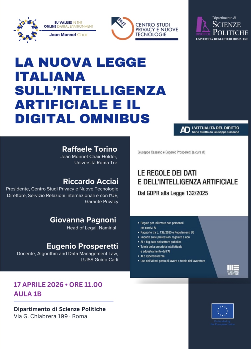 il 17 aprile alle ore 11.00 in aula 1 a si terrà il seminario dal titolo: La nuova legge italiana sull'Intelligenza Artificiale e il digital Omnibus