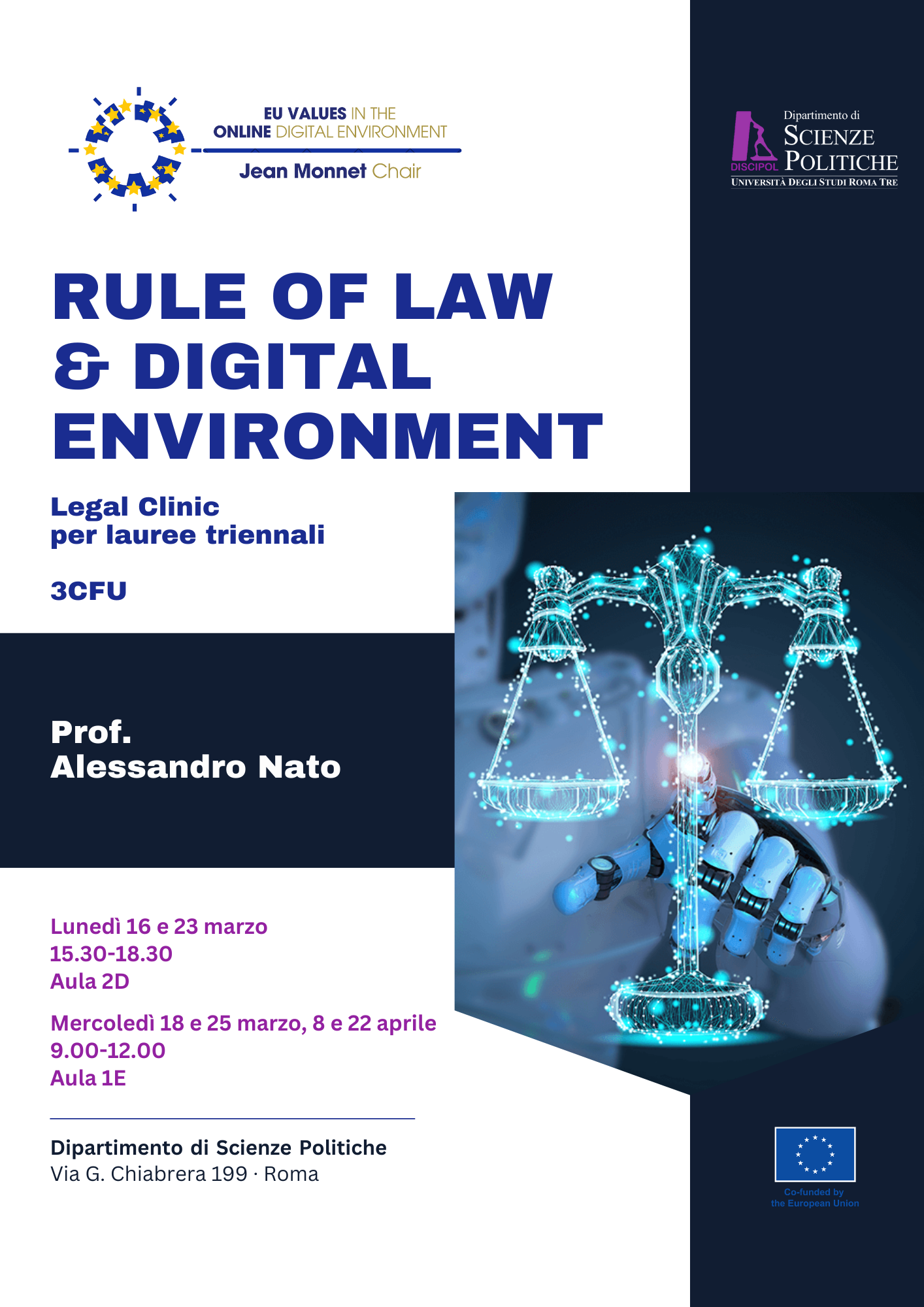 Lunedì 16 marzo in aula D dalle 15.30 alle 18. 30 avrà luogo una Legal clinic per lauree triennali tenuta dal prof. Alessandro Nato. In allegato la locandina con i dettagli dell'iniziativa.