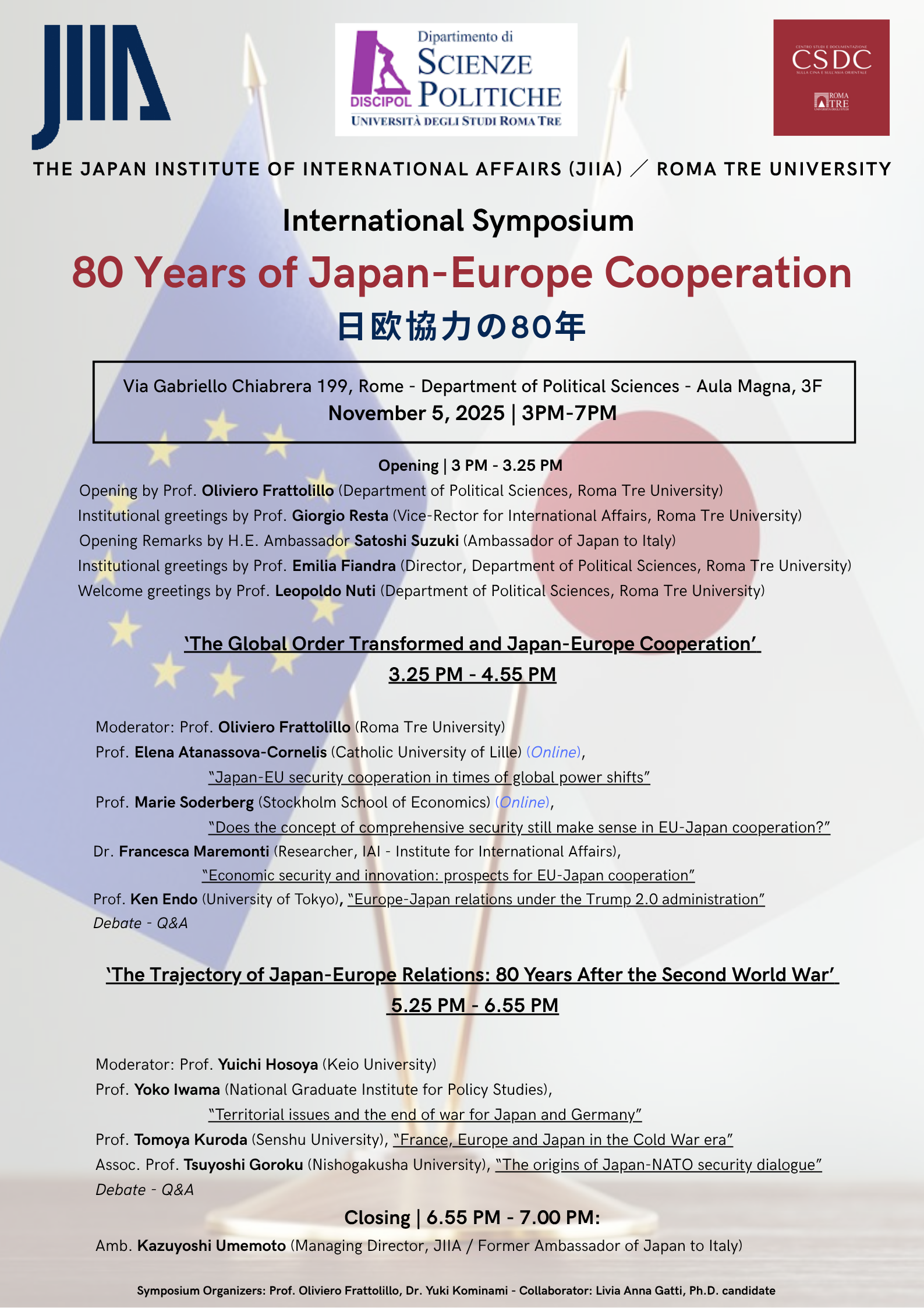 Mercoledì 5 novembre dalle 15:00 alle 19:00 presso l'aula Magna Renata Fonte avrà luogo l' evento dal titolo 80 Years of Japan-Europe Cooperation. Si allega la locandina con il dettaglio degli interventi