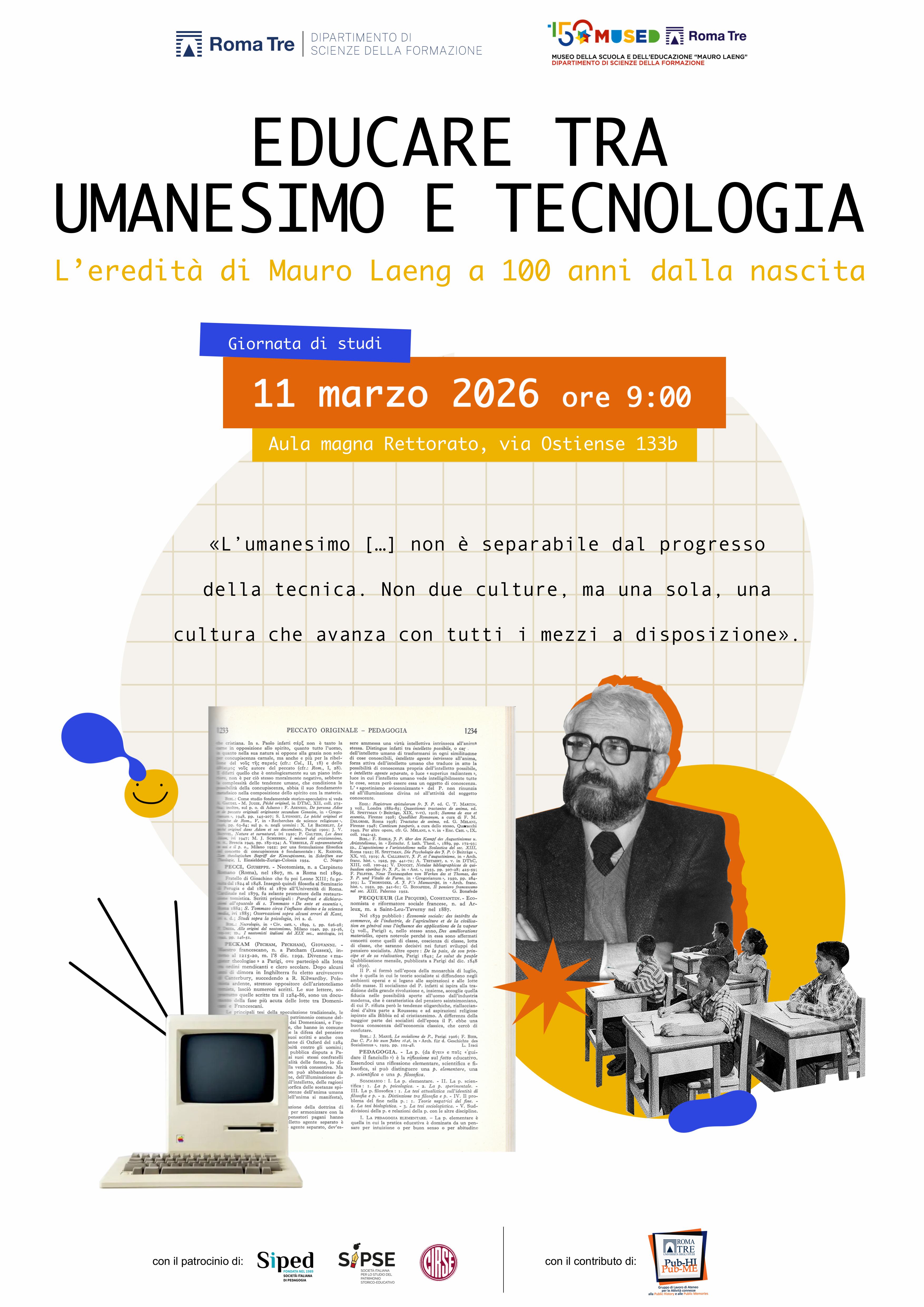 In occasione del centenario della nascita di Mauro Laeng (1926–2004), uno dei più importanti intellettuali del secondo Novecento nel campo delle scienze dell’educazione, l’Università Roma Tre promuove una giornata di studi in suo onore.