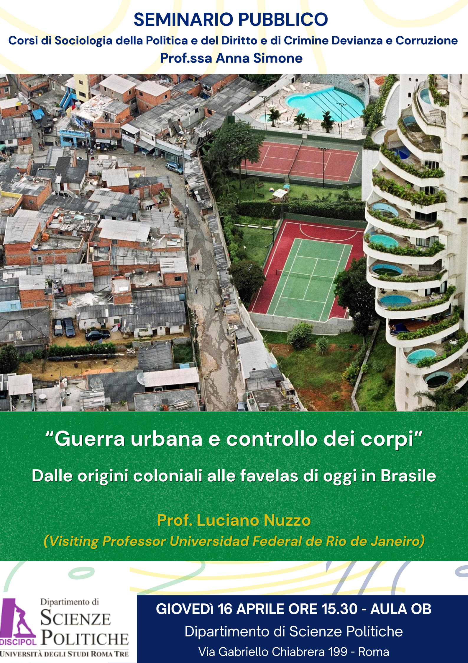 Giovedì 16 aprile alle ore 15:30, presso l’Aula 0B del Dipartimento di Scienze Politiche (via Gabriello Chiabrera 199), il prof. Luciano Nuzzo (Universidad Federal de Rio de Janeiro) terrà un seminario pubblico dal titolo “Guerra urbana e controllo dei corpi. Dalle origini coloniali alle favelas di oggi in Brasile”.