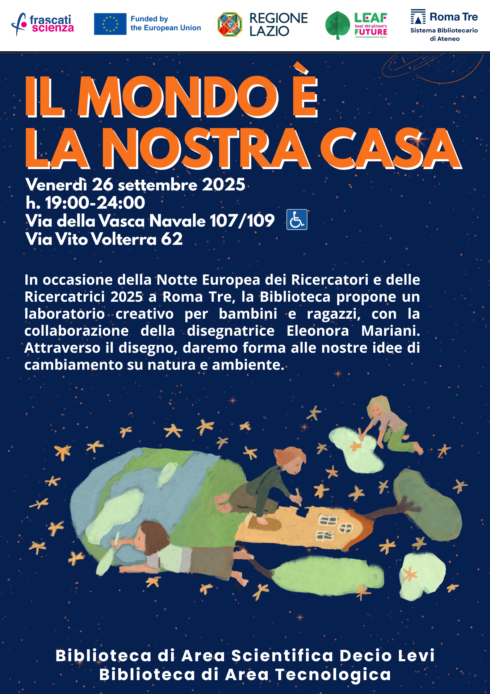 In occasione della Notte Europea dei Ricercatori e delle Ricercatrici 2025, venerdì 26 settembre 2025 dalle 19:00 alle 24:00, il Sistema Bibliotecario di Ateneo di Roma Tre propone un’iniziativa speciale dedicata a bambini e ragazzi: il laboratorio creativo “Il mondo è la nostra casa”.