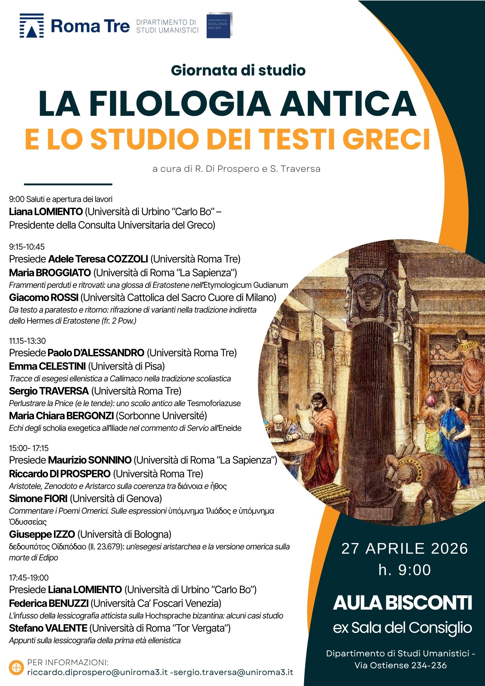 Lunedì 27 aprile alle ore 09:00 presso l’Aula Bisconi (ex Sala del Consiglio), si terrà la giornata di studio “La filologia antica e lo studio dei testi greci”.