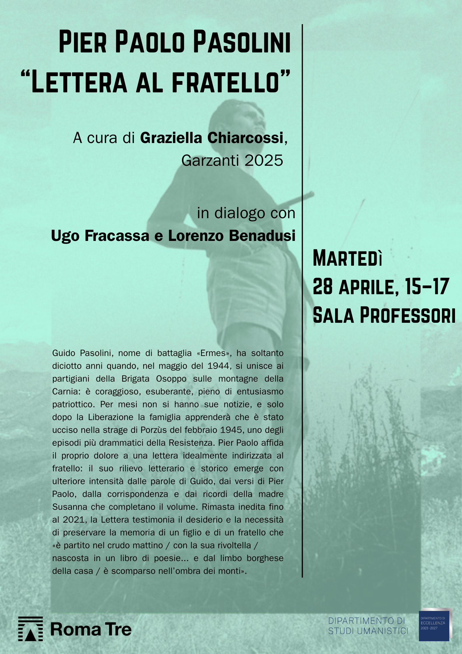 Martedì 28 aprile, dalle ore 15:00 alle ore 17:00, presso la Sala Professori del Dipartimento di Studi Umanistici, si terrà un incontro con Graziella Chiarcossi in occasione della pubblicazione del volume Lettera al fratello di Pier Paolo Pasolini (Garzanti, 2025), da lei curato.