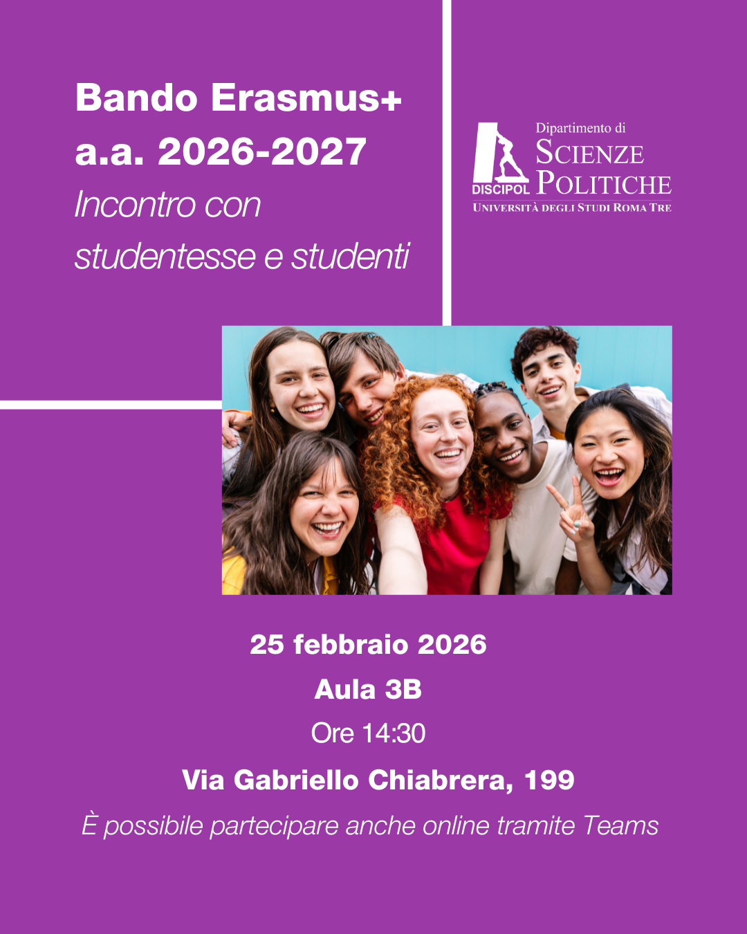 Il 25 febbraio, dalle 14.30 in Aula 3B l'Ufficio Erasmus del Dipartimento e i docenti coordinatori Erasmus, il Professor Nicolangelo Becce e la Prof.ssa Daniela Huber, daranno informazioni utili sul bando e risponderanno alle domande di studenti e studentesse, chiarendo eventuali dubbi. Interverrà inoltre la Prof.ssa Laura Fasanaro, docente delegata all’Internazionalizzazione.