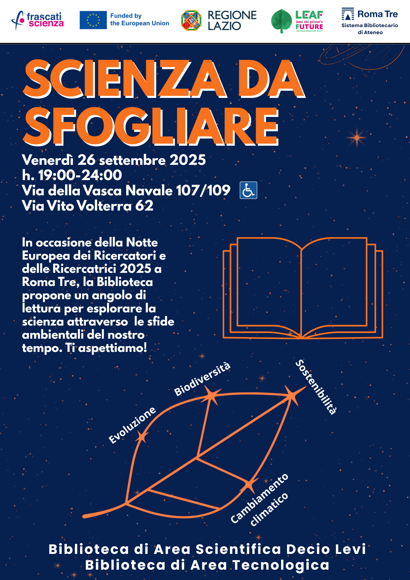 In occasione della Notte Europea dei Ricercatori e delle Ricercatrici 2025, il Sistema Bibliotecario di Ateneo di Roma Tre invita tutta la comunità a partecipare all’iniziativa “Scienza da sfogliare”, che si terrà venerdì 26 settembre 2025, dalle 19:00 alle 24:00, presso la Biblioteca di Area Scientifica Decio Levi e la Biblioteca di Area Tecnologica (Via della Vasca Navale 107/109 e Via Vito Volterra 62).
